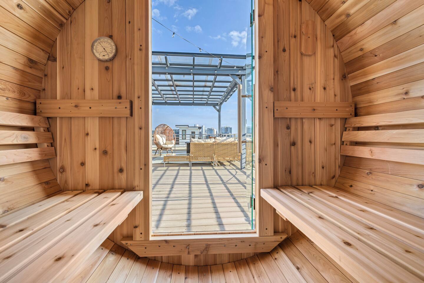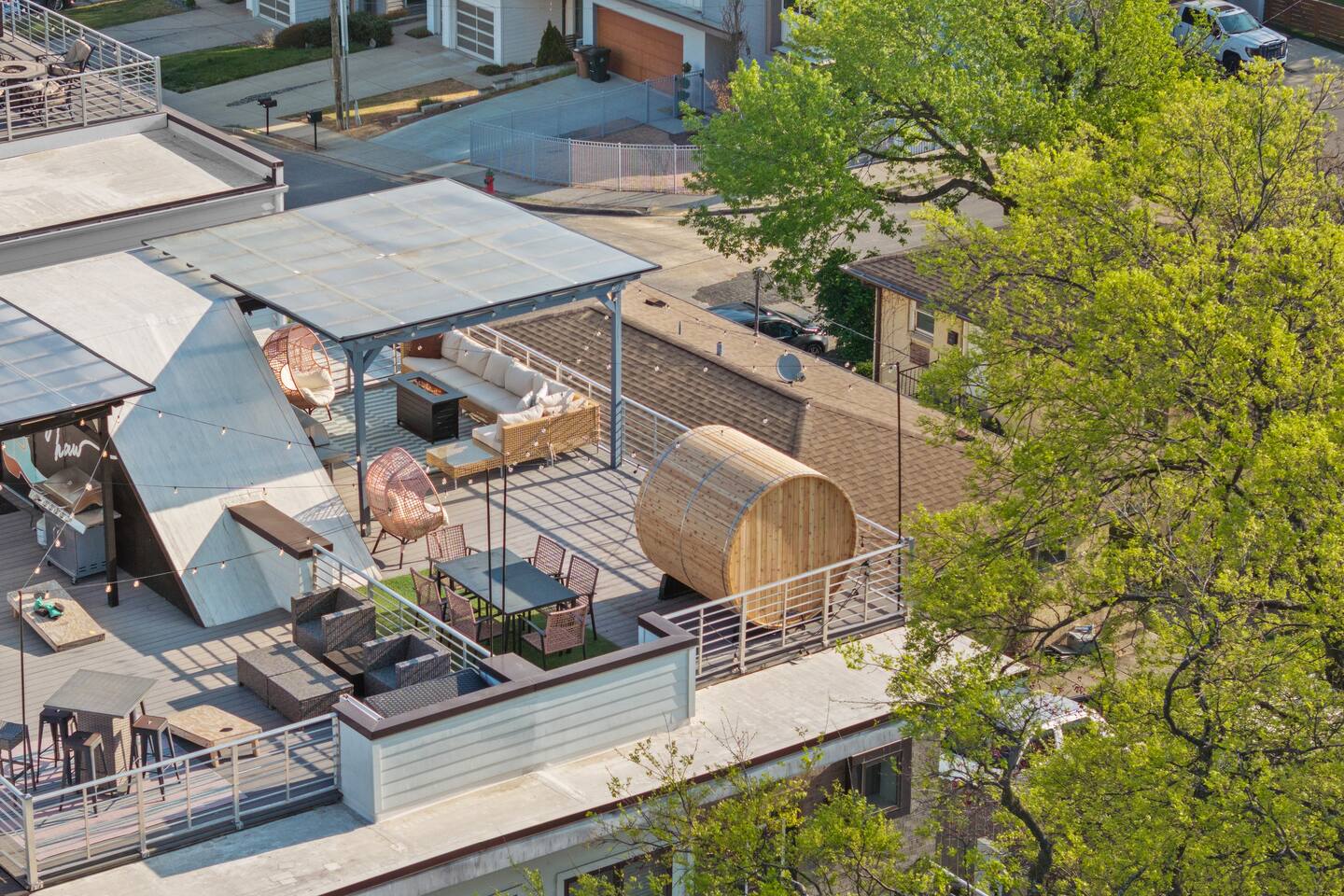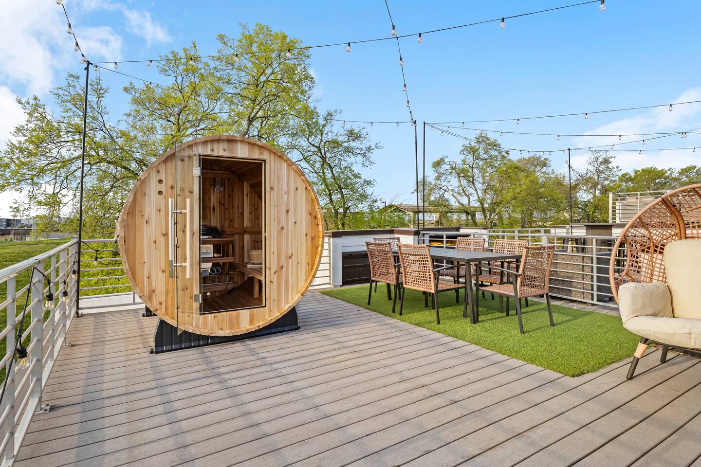 Start your Nashville trip above the city… unwinding in a private barrel sauna as the skyline glows around you. The Wren by Elevay & Co. sits in the heart of the Gulch, walkable to Nashville’s best restaurants, coffee, and nightlife, and just 5 minutes to Broadway. With a private rooftop built for sunset hangs, 14 beds for large groups, and intentional spaces designed for connection, this is the kind of stay your group will talk about long after the trip ends.