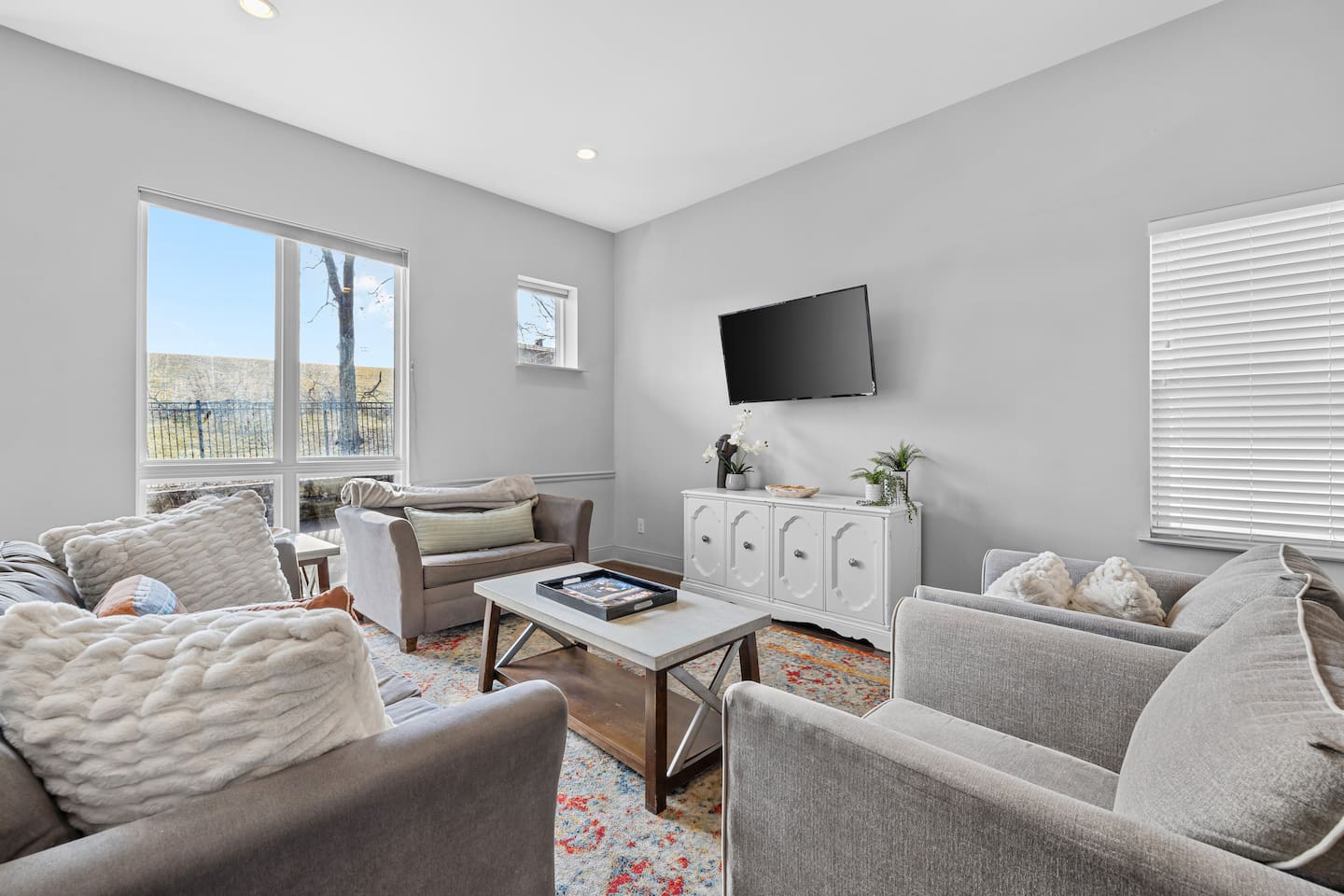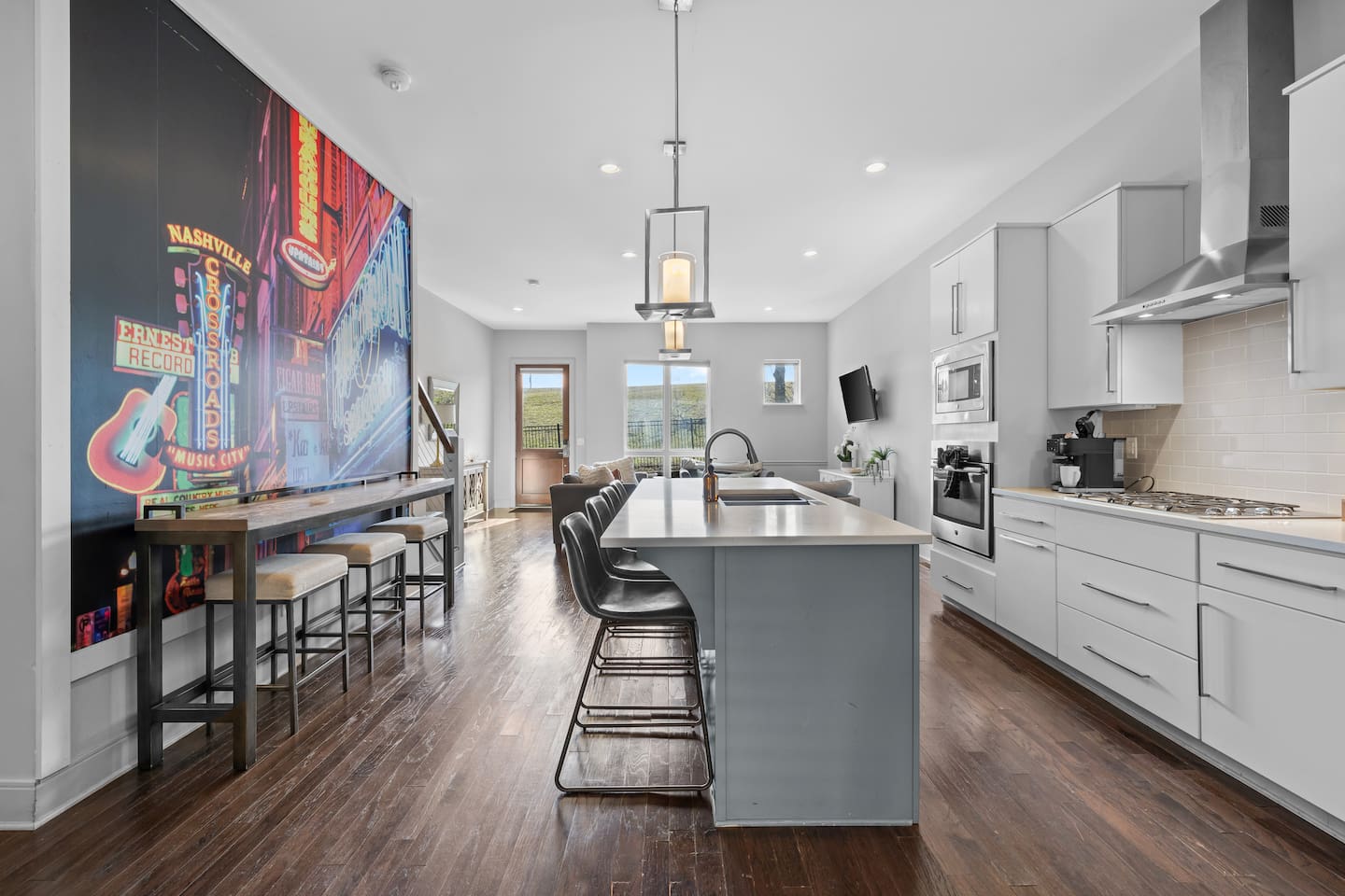 Surrounded by sweeping skyline views and positioned above the city’s most walkable neighborhood, this listing offers a level of scale, privacy, and perspective that’s exceptionally rare this close to Broadway, 12 South, and Downtown. Two attached luxury homes come together seamlessly here, creating a single elevated stay that feels more like a private urban estate than a typical city rental. Booking this home means securing an entire section of the Nashville skyline for your group alone. With 8 bedrooms and 24 beds across two full homes, there’s room to spread out, reset, and reconnect — all while staying moments from the restaurants, music, and energy that define the city. It’s the kind of setup almost never found in a prime urban location. Each residence stands confidently on its own, yet together they function as one cohesive experience. Two expansive living areas, two fully equipped kitchens, and two private rooftop lounges allow your group to move naturally throughout the day — finding space when it’s needed and coming together when it matters. The rooftops are what set this stay apart. Elevated above the city with uninterrupted views in every direction, the skyline becomes part of the experience rather than the background. Fire pits draw everyone in as the sun dips and the lights of Nashville stretch across the horizon. These are the evenings that linger — unplanned, unrushed, and unforgettable. Every detail of this combined home is intentional. The layouts are built for groups. The elevation brings a sense of calm. The walkability removes friction from every plan. Hosted by Elevay & Co., this stay is designed for travelers who recognize how rare it is to find this much space, this much privacy, and this much of the city — all in one place. What Makes This Stay Rare: 🌇 Two private rooftop lounges with fire pits and full skyline immersion 📍 Prime Gulch location — walk everywhere, retreat above it all 🛏️ 8 bedrooms + 26 total beds across two full homes ☕ Two fully stocked coffee bars for slow mornings and easy starts 🍽️ Two chef-style kitchens designed to handle group meals with ease 🎶 Minutes to Broadway, Downtown, 12 South, Music Row, and more 🚗 Garage parking + free street parking ✅ Early check-in & late check-out when available Location Highlights 🛻 Walkable to the Gulch / Edgehill 🛍️ 5 min to 12 South 🍴 5 min to Broadway’s nightlife 🏈 9 min to Titans Stadium & Topgolf ✈️ 14 min to BNA Airport 🎶 20 min to Grand Ole Opry This is one of the few places where you can experience Nashville fully — then step back above it all when the day is done. PARKING: Guests will have the option to park in either garages. Each home has its own private two car garage. There's also additional street parking in front of the homes and throughout the neighborhood that's first come first serve. WE DO NOT RENT TO LOCALS. IF YOU HAVE QUESTIONS, PLEASE INQUIRE.